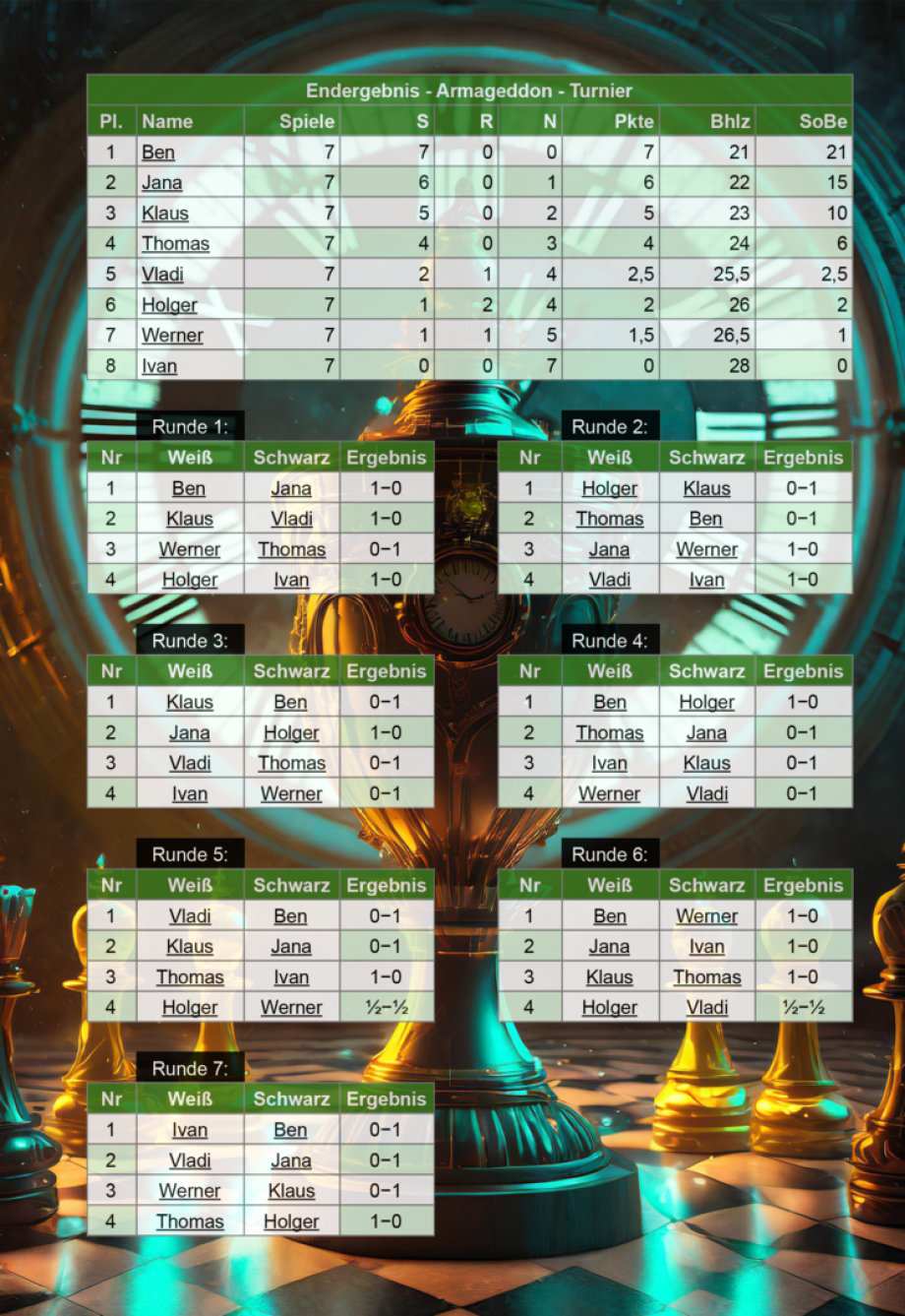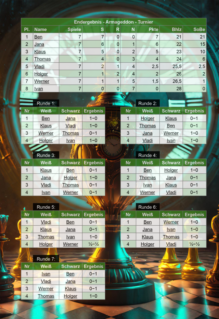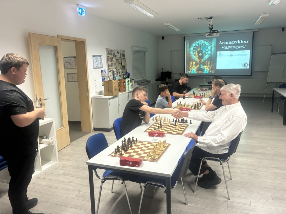 29.08.2025: Der Vereinspokalsieger aus dem letzten Jahr lässt nichts anbrennen: Ben bleibt beim 1. Armageddon-Turnier ungeschlagen mit 7 aus 7 möglichen Punkten. In durchaus spannenden Partien mit einer eher ungewohnten Zeitnahme von 3 Minuten im Sanduhr-Modus wurde von den 8 Teilnehmern um einige Punkte hart gekämpft. Den 2. Platz sicherte sich unser Neuzugang Jana, dicht gefolgt vom drittplatzierten Klaus. Wir hoffen, dass alle Spieler viel Spaß an dem kleinen Turnier hatten und freuen uns schon auf kommende Wettkämpfe!